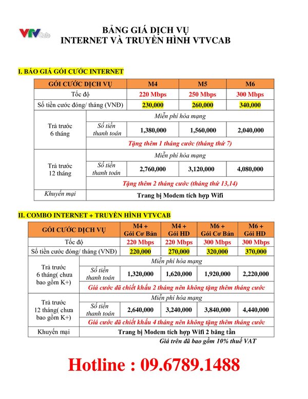 Đăng ký liên hệ Zalo chúng tôi : 09.6789.1488 - Nhận tư vấn miễn phí soạn tin nhắn : DK VN gửi 09.6789.1488 2. Giá cước gói Analog của Truyền hình cáp Việt Nam : - Giá cước : 110.000 đ/tháng - Bao gồm : 70 kênh cơ bản, chất lượng tiêu chuẩn. 3. Giá cước gói HD của Truyền hình cáp Việt Nam : - Giá cước : 160.000 đ/tháng - Bao gồm : 240 kênh chất lượng chuẩn HD, âm thanh sống động. 4. Giá cước gói Internet và Truyền hình cáp Việt Nam : - Gói combo phổ biến nhất : 220.000 đ/tháng - Bao gồm : Internet 220Mbps và Truyền hình cáp 70 kênh